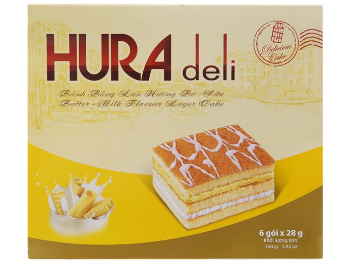 Bánh bông lan hương bơ sữa Hura Deli hộp 168g (6 cái)