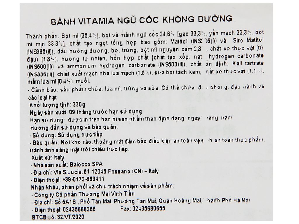 Bánh quy ngũ cốc không đường Vitamia gói 330g