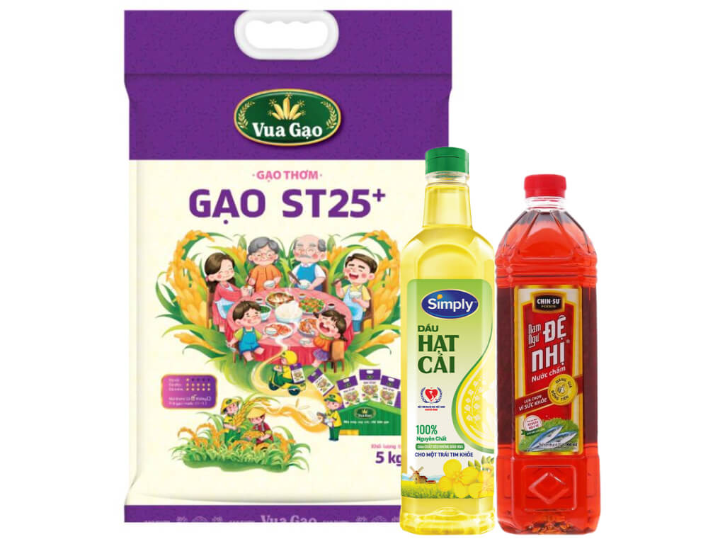 Combo đầy đủ (Dầu hạt cải Simply 1l, gạo ST25+ Vua Gạo 5kg và nước chấm Nam Ngư Đệ Nhị 900ml)
