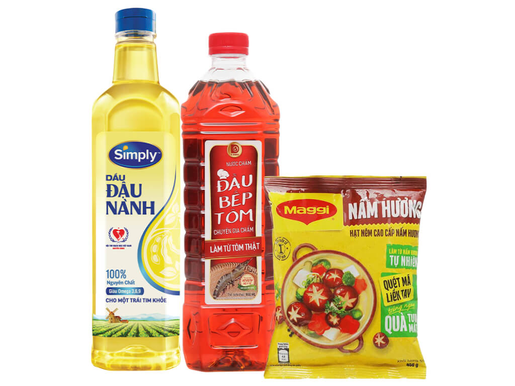 Combo thiết yếu (Dầu đậu nành Simply 1 lít, nước chấm Đầu Bếp Tôm 800ml và hạt nêm Maggi nấm hương 450g)