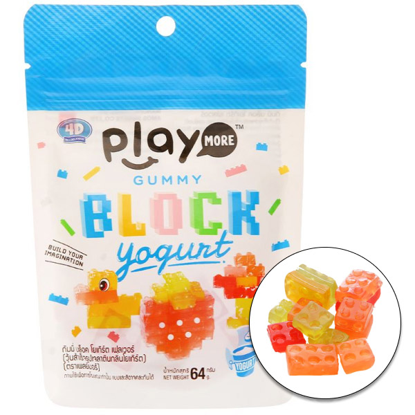 Kẹo dẻo xếp hình vị sữa chua Play More gói 64g: Sản phẩm có vị sữa chua béo thơm, hình dáng 3D ngộ nghĩnh hấp dẫn. Sản phẩm có giá khoảng 33.000đ.