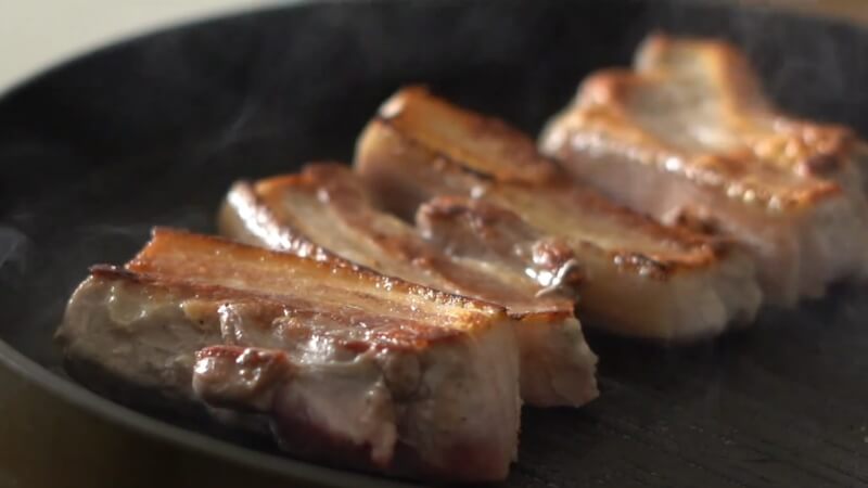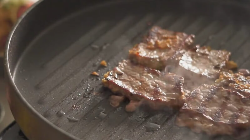 Làm nóng chảo với một ít dầu, sau đó đặt thịt đã ướp lên nướng. Khi nướng, đảm bảo thịt chín đều, có màu vàng đẹp, giữ được độ mềm và mọng nước.