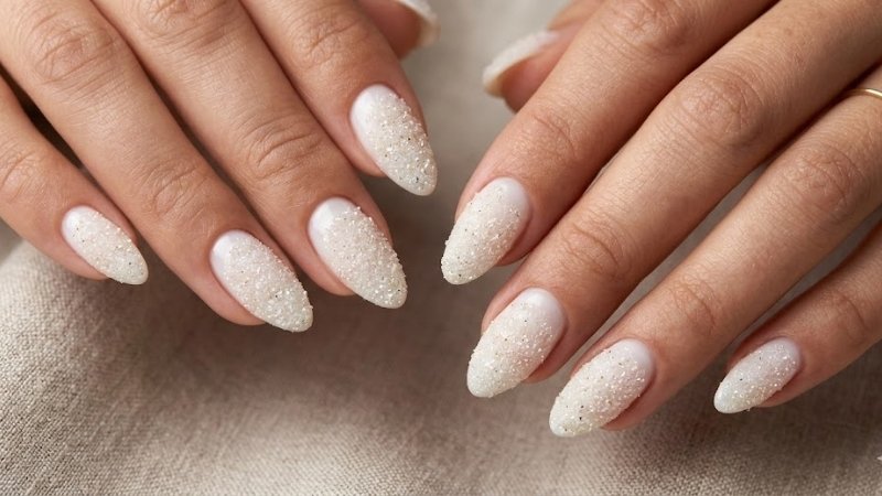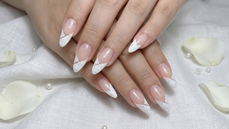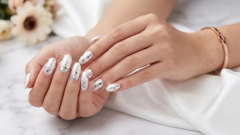 - Không phủ kim tuyến quá dày: Lớp kim tuyến quá đặc sẽ che khuất đi vẻ trong trẻo của lớp màu sơn trắng nguyên bản. Thợ nail chỉ nên rắc một lớp siêu mỏng hoặc tạo hiệu ứng nhạt dần để đôi bàn tay trông thanh thoát hơn.