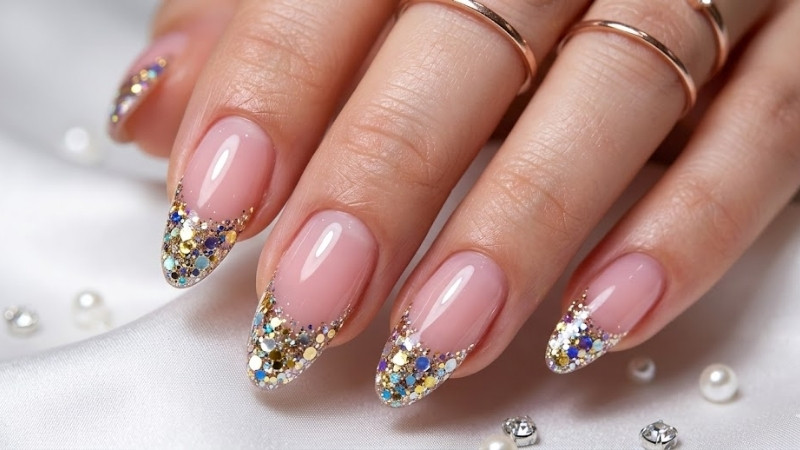 Nếu bạn yêu thích sự tối giản nhưng vẫn muốn có điểm nhấn, kiểu viền phần đầu móng chính là một gợi ý tuyệt vời. Thiết kế này lấy cảm hứng từ phong cách French manicure kinh điển nhưng được biến tấu bằng những hạt kim tuyến lấp lánh. Phần chân móng thường được sơn màu nude hoặc hồng nhạt để tạo ra sự tương phản nhẹ nhàng, thanh thoát.