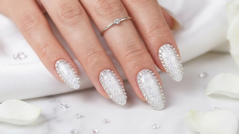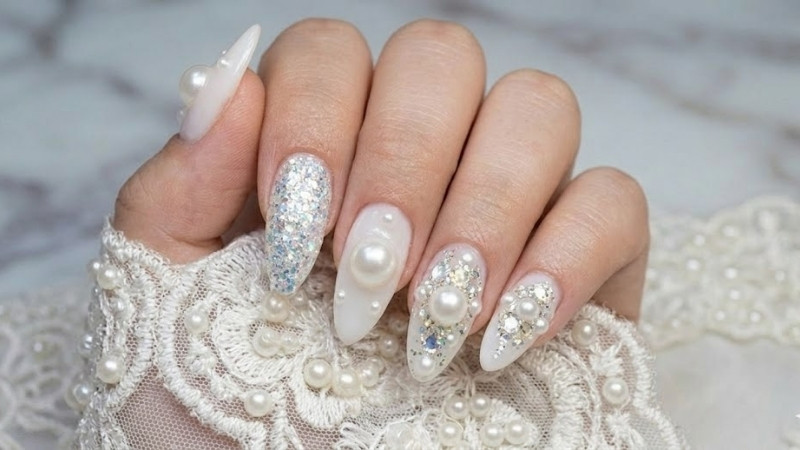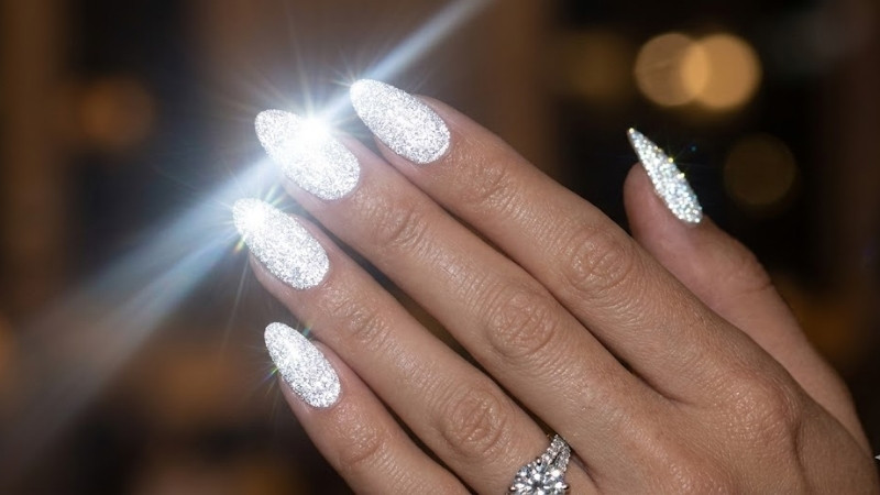 Sự kết hợp giữa đá pha lê và kim tuyến chính là lựa chọn hoàn hảo cho những cô nàng theo đuổi phong cách sang chảnh, quyền lực. Những viên đá lấp lánh đính trên nền kim tuyến trắng tạo ra hiệu ứng phản quang tuyệt đẹp dưới ánh đèn. Bộ móng lộng lẫy này thường được các cô dâu ưu ái lựa chọn để tỏa sáng trong ngày trọng đại của mình.