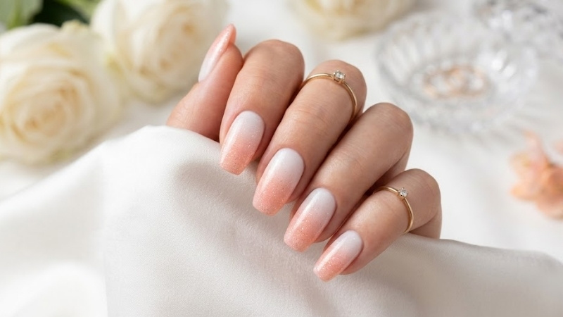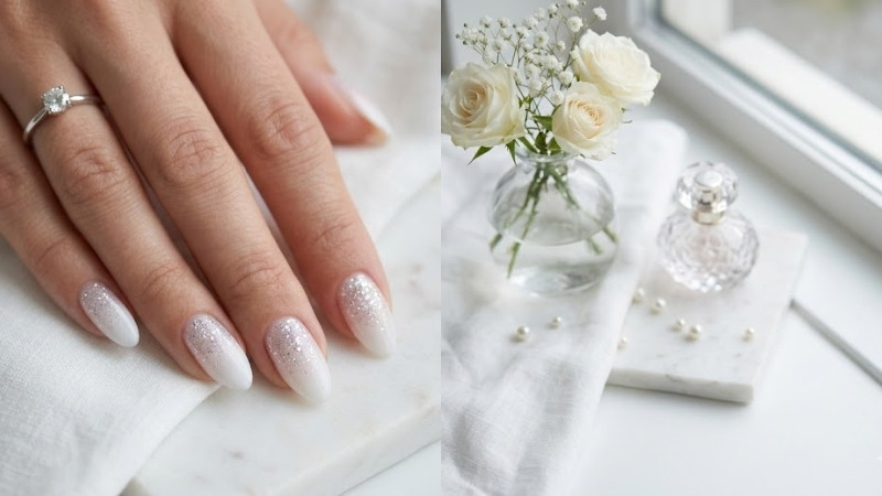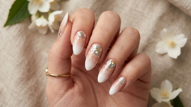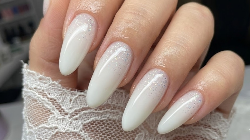 Nail trắng sữa phủ kim tuyến nhẹNail trắng ombre kim tuyến