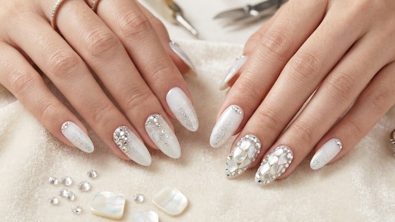 Nail trắng đính đá kết hợp kim tuyếnNail trắng kim tuyến kiểu Hàn Quốc