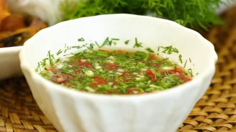 Cuối cùng, bạn thái nhuyễn thì là và cho vào tô nước chấm, khuấy nhẹ một lần nữa là hỗn hợp nước chấm đã hoàn tất.