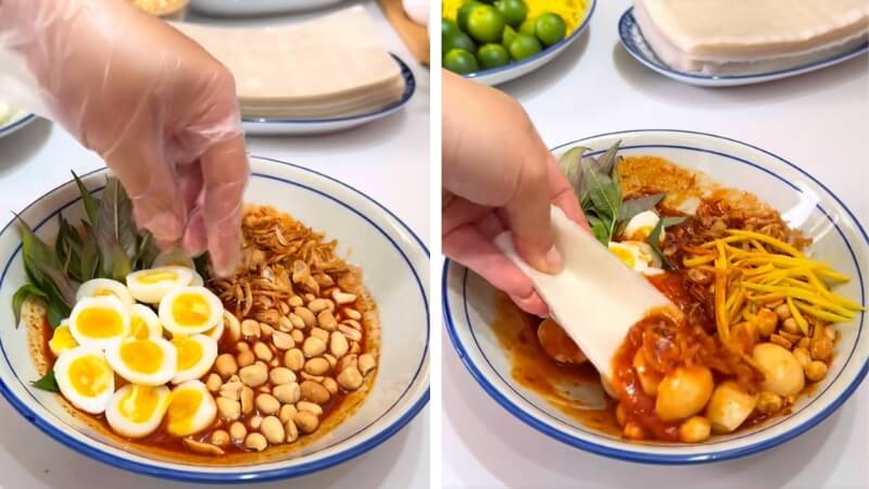 Bánh tráng nhúng nhanh qua nước, không ngâm quá lâu để tránh bị nhão. Khi bánh vừa mềm, cuộn gọn lại là có thể dùng ngay với phần xốt đã chuẩn bị.