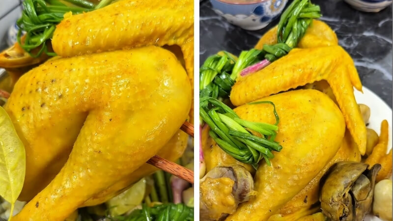 Khi gà đã chín, mở nắp nồi, cho hành lá bùi cắt khúc vào, rồi đậy nắp lại ủ thêm 3–5 phút để hành chín tới, dậy mùi thơm trước khi tắt bếp.