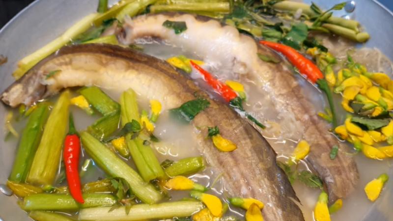 Nồi lẩu cá chạch nấu mẻ hoàn chỉnh có màu nước lẩu vàng óng từ khóm, nước dùng trong vắt và dậy mùi thơm đặc trưng của mẻ chua và sả. Thịt cá chạch lấu sau khi nấu vẫn giữ được độ ngọt, béo tự nhiên, kết hợp với vị chua thanh nhẹ của mẻ, tạo nên một món ăn vô cùng hài hòa.