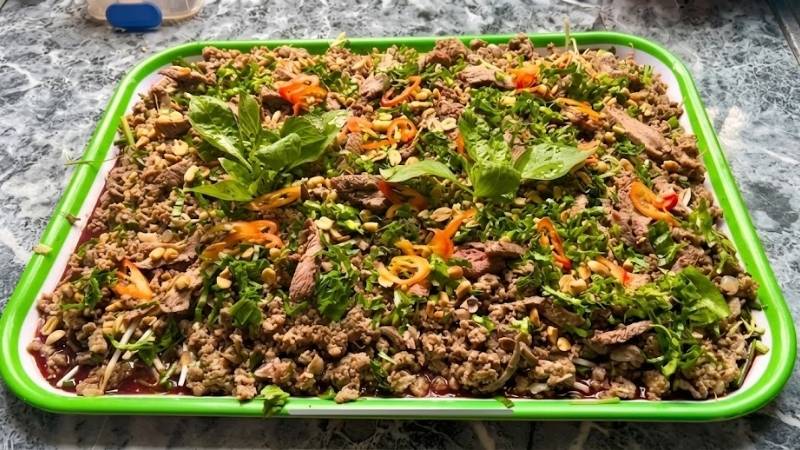 Bạn chuẩn bị đĩa và lót một lớp rau sống gồm giá đỗ, tía tô, ngò gai cắt nhỏ xuống dưới cùng. Tiếp đến, cho phần thịt vịt băm vừa xào xong còn nóng hổi lên trên lớp rau, rồi rưới đều tiết vịt lên bề mặt thịt băm để tạo độ kết dính và hương vị đặc trưng.