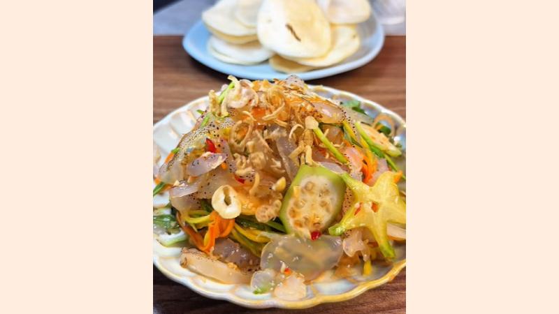 Món gỏi sứa xoài khế chua ngọt khoác lên mình một màu sắc vô cùng rực rỡ và bắt mắt từ các loại rau củ tự nhiên. Gắp một đũa gỏi, bạn sẽ lập tức cảm nhận được độ giòn sần sật đầy thú vị của thịt sứa tươi, đan xen cùng vị chua thanh của xoài, khế, độ chát nhẹ của chuối và nước mắm chua ngọt cay cay kích thích vị giác cực kỳ.