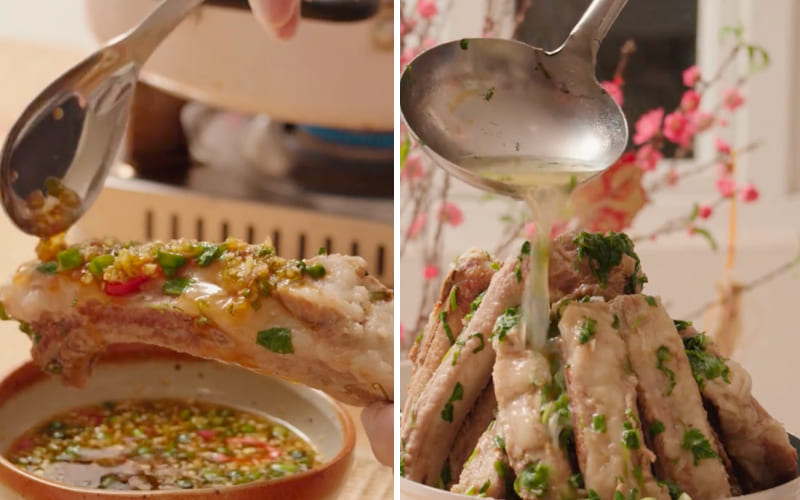 Xếp sườn vào 1 chiếc nồi ưng ý, xếp sườn thành tháp sao cho đẹp mắt. Xối phần nước dùng đã chuẩn bị lúc này vào, thêm phàn ớt đỏ vào nữa cho tăng hương vị, đẹp mắt nhé.