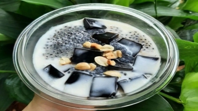 Cuối cùng, bạn chỉ cần cắt nhỏ sương sáo cho vào bát, thêm hạt chia đã ngâm nở lên trên bề mặt. Để món ăn thêm phần hấp dẫn, bạn hãy rưới nước cốt dừa béo ngậy, nước đường thanh ngọt và thêm một ít đá lạnh để cảm nhận trọn vẹn hương vị giải nhiệt tuyệt vời.