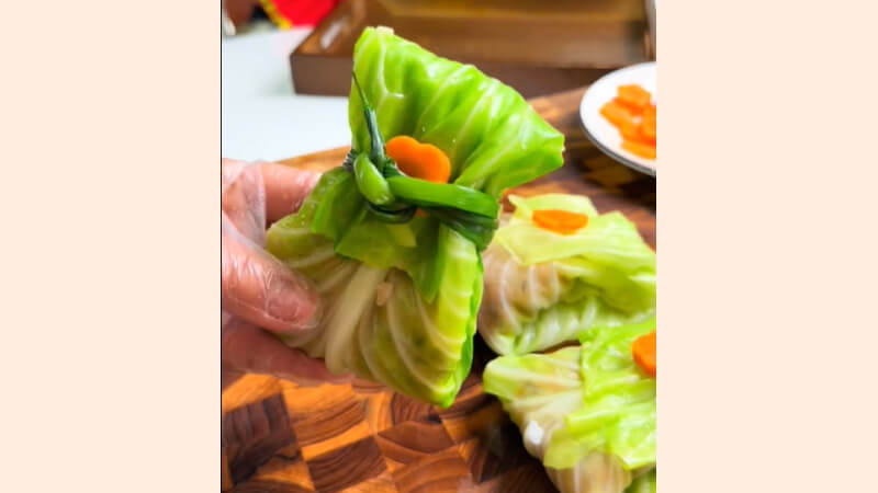 Nếu đang tìm một món canh vừa thanh mát vừa giàu dinh dưỡng cho dịp Tết này, canh bắp cải túi tiền chắc chắn là lựa chọn đáng thử. Món ăn gây ấn tượng với những “túi” bắp cải bọc nhân thịt mềm ngọt, hòa quyện trong nước dùng nhẹ nhàng nhưng đậm đà. Chỉ cần một chút khéo léo, bạn đã có ngay món ăn vừa ngon vừa đẹp để chiêu đãi cả nhà.