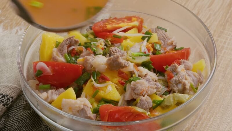 Khi nước sôi, hớt bọt và thả sấu vào, đun nhỏ lửa 15–20 phút cho sườn mềm. Sau đó nêm nếm lại gia vị cho vừa ăn, cho cà chua bổ múi cau vào đun thêm khoảng 30–40 giây. Cuối cùng thả hành lá, mùi tàu, ớt và giá đỗ vào, đảo nhẹ rồi tắt bếp.