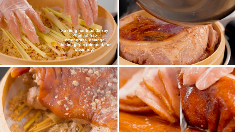 Cho nước vào nồi hấp, lót xửng hấp với xác sả riềng lúc nãy, trải thịt đều lên, đậy nắp và hấp với lửa vừa trong khoảng 1 tiếng. Hấp đến khi thịt chín hoàn toàn, lấy ra để nguội và cắt nhỏ thành miếng vừa ăn là hoàn thành.