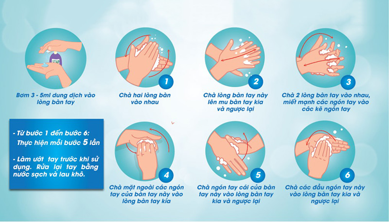 Đầu tiên, hãy làm ướt hai lòng bàn tay dưới vòi nước, cho xà phòng vào lòng bàn tay xoa đều; chà hai lòng bàn tay vào nhau rồi đến chà lòng bàn tay này lên mu bàn tay kia và ngược lại.