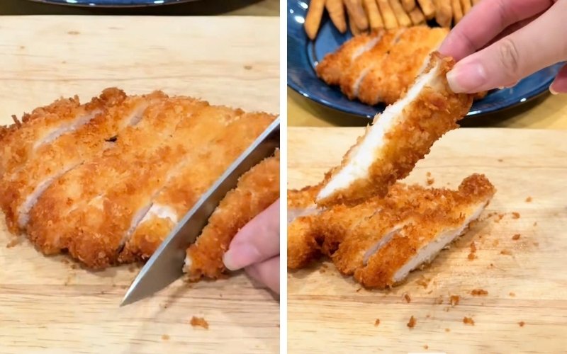 Món gà giòn kết hợp khoai tây chiên nên ăn ngay khi còn nóng để giữ độ giòn của lớp vỏ ngoài và độ mềm, mọng nước bên trong. Phần gà bên ngoài vàng rụm, giòn tan, trong khi thịt bên trong vẫn mềm ngọt, thơm tự nhiên, có thể dùng kèm các loại sốt yêu thích hoặc salad để cân bằng hương vị.