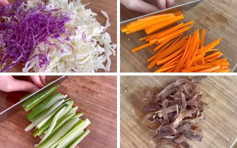 Bắp cải trắng và bắp cải tím bào nhỏ vừa ăn. Cà rốt và dưa leo cắt thành sợi mảnh, đều nhau. Cho bắp cải trắng, bắp cải tím, dưa leo và cà rốt vào tô lớn, thêm 1 thìa canh đường và 1/2 thìa cà phê muối, trộn đều và để yên trong khoảng 20 phút để rau củ ngấm gia vị, giữ được độ giòn tự nhiên.