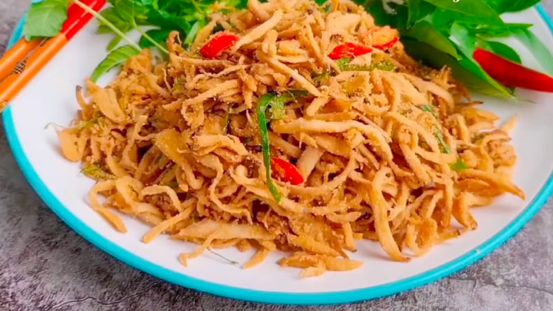 Đun nóng dầu thả nấm vào chiên, sợi nấm chuyển sang màu vàng thì tắt bếp và vớt nấm ra. Trộn với ít muối, đường, bột ngọt, lá chanh đã cắt, thêm vài lát ớt, thính gạo vào và trộn đều lên cho nấm thấm đều gia vị là hoàn thành.