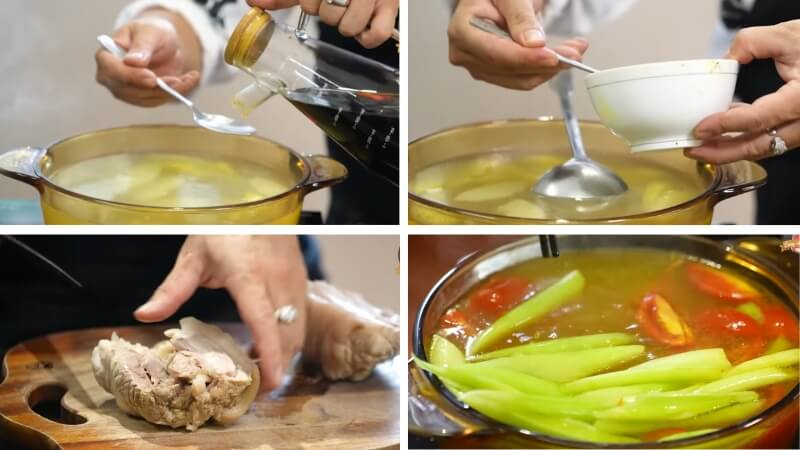 Khuấy đều rồi thả cà chua bổ cau vào tạo màu và vị chua thanh. Khi nước sôi trở lại, cho thịt chân giò đã thái miếng và dọc mùng vào, đun thêm vài phút cho thấm đều gia vị.
