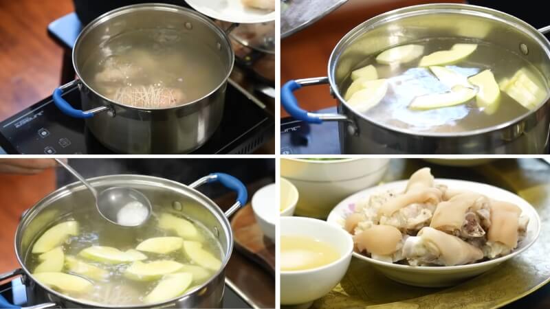 Đun sôi 1 lít nước, cho vào 40g gừng đập dập và ½ thìa canh muối tinh để khử mùi hôi. Khi nước sôi, cho chân giò và móng giò vào chần sơ, đảo nhẹ vài lần cho săn mặt thịt rồi vớt ra rửa sạch bằng nước lạnh.