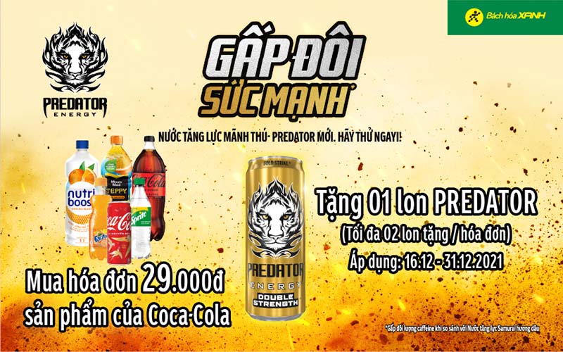 Nội dung chương trình: Từ ngày 16/12 - 31/12/2021, với mỗi hóa đơn bất kỳ từ 29.000đ trở lên tại Bách hóa XANH khách hàng được tặng 1 lon nước tăng lực Predator lon 330ml.