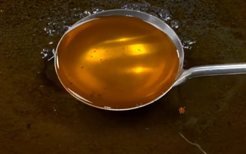 Đun sẵn 1 ấm nước sôi, tỉ lệ nước : bột mè = 1:0.85. Thêm nước từ từ vào bột mè, vừa thêm vừa khuấy đều bằng cây khuấy. Ban đầu hỗn hợp khá đặc, sau một thời gian khuấy, dầu mè bắt đầu nổi lên. Lắc nồi nhẹ để dầu nổi nhanh hơn và dùng thìa vớt dầu liên tục cho đến khi hết.