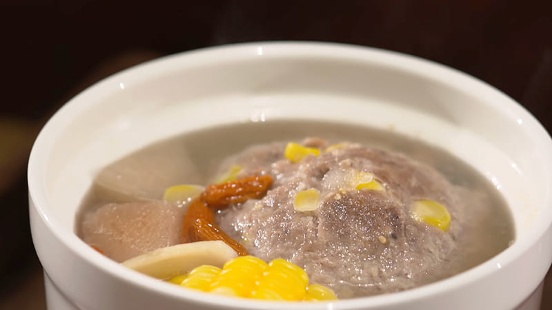 Đun nóng 700ml nước dùng cùng 1 muỗng cà phê hạt nêm, ½ muỗng cà phê bột ngọt, 1 muỗng cà phê dầu hào, lê cắt khối, phần bắp mỹ còn lại, gừng cắt lát, kỷ từ. Nấu với lửa vừa đến khi phần củ quả chín mềm.