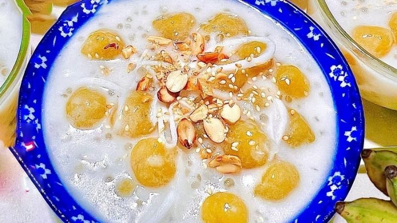Chè chuối viên bột báng có màu vàng tươi của chuối nổi bật trên nền nước cốt dừa trắng mịn, béo ngậy. Những viên chuối dai mềm ăn kèm với bột báng sần sật, dừa sợi và lạc rang tạo nên hương vị ngọt thanh, bùi thơm rất đặc trưng. Món chè này có thể dùng nóng hay lạnh đều ngon, cực kỳ phù hợp để làm món tráng miệng chiêu đãi gia đình.