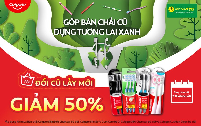 Nhằm thực hiện sứ mệnh “Bảo vệ môi trường” cùng thông điệp "Góp bàn chải cũ dựng tương lai xanh", Bách hóa XANH x Colgate giới thiệu chương trình “Mang bàn chải cũ, lấy bàn chải mới giảm giá đến 50%”, đồng hành với mọi gia đình Việt Nam trong việc bảo vệ và xây dựng môi trường xanh - sạch - đẹp.