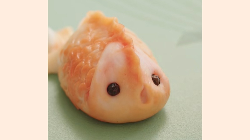 Đặt nhân vào giữa, gấp đôi lớp vỏ nhưng chỉ bóp chặt ở một đầu để làm đầu cá. Phần thân sau dùng tay ấn để làm đuôi cá dẹp, dùng ống húttạo hình vảy cá uốn lượn, phần đuôi dùng kéo cắt nhẹ hoặc dùng dao ấn nhẹ để tạo thành các vân và có độ xòe mềm mại. Cuối cùng, dùng đũa tạo hình miệng và gắn 2 hạt tiêu đen làm mắt chú cá.