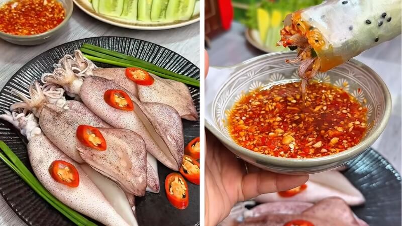 Mực hấp cuốn bánh tráng là món ăn “đổi gió” lý tưởng cho những bữa tụ họp cuối tuần. Vị mực ngọt tự nhiên, thơm nhẹ mùi gừng sả, cuốn cùng rau sống và chấm nước mắm chua ngọt đậm đà – ăn một cuốn là muốn cuốn thêm.