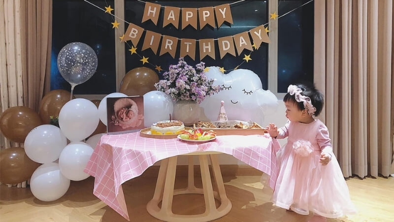 Tận dụng bức tường trống đẹp nhất, trang trí thêm rèm voan, banner chữ "Happy Birthday" và một bàn tiệc nhỏ xinh, ấm cúng.
