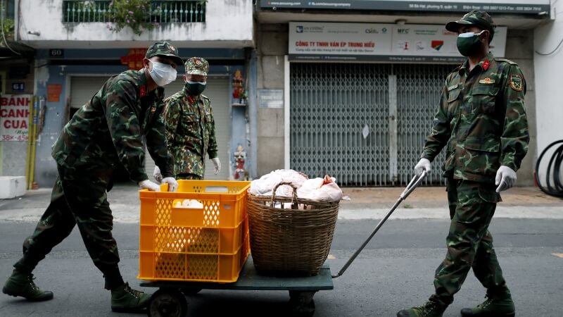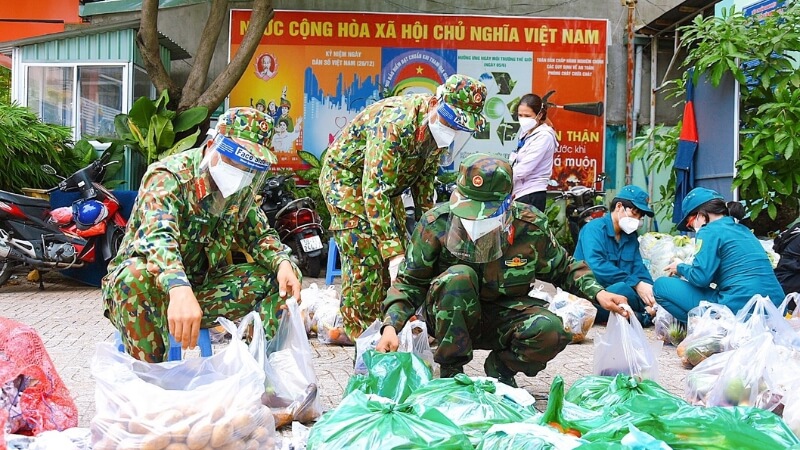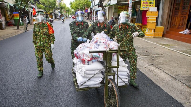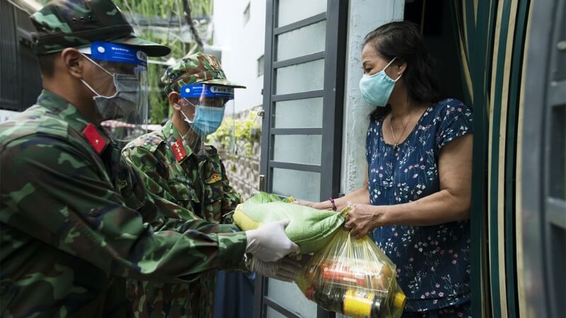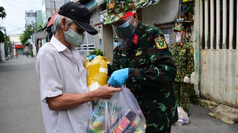 Bộ đội phát khẩu trang, nhu yếu phẩm phòng dịch.