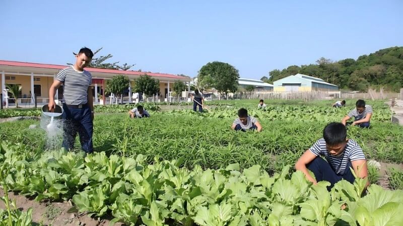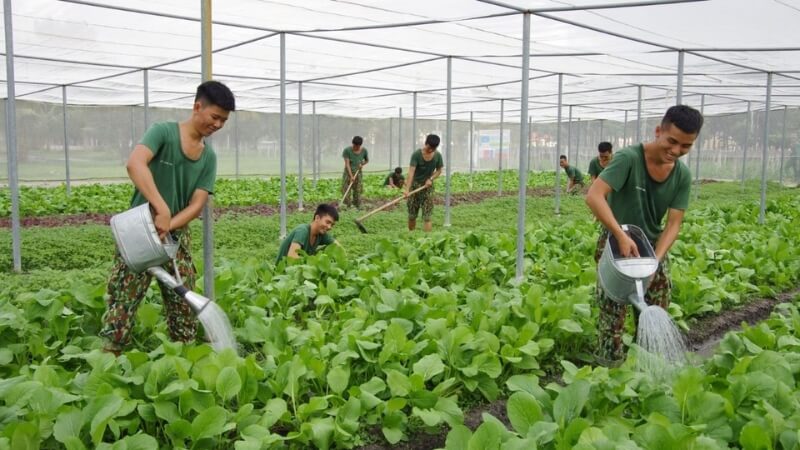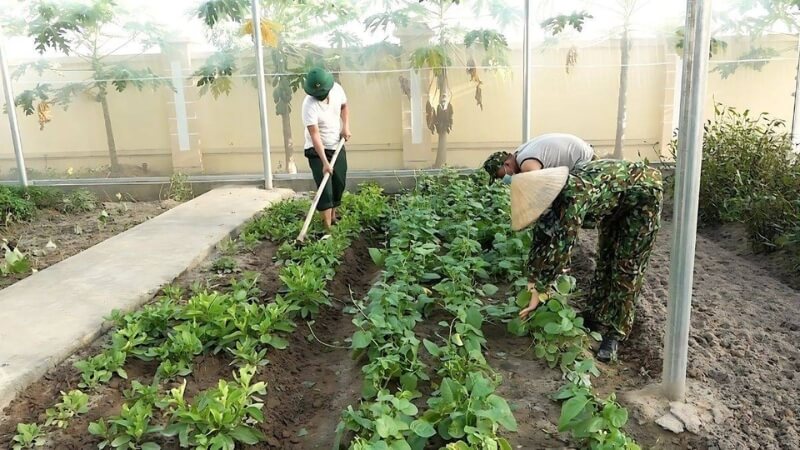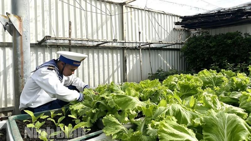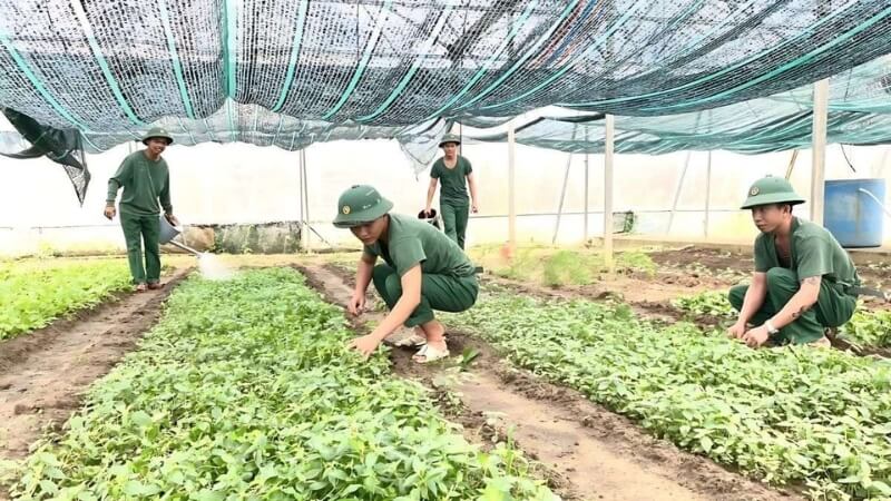 Chiến sĩ chăm sóc rau để chuẩn bị cho bữa ăn