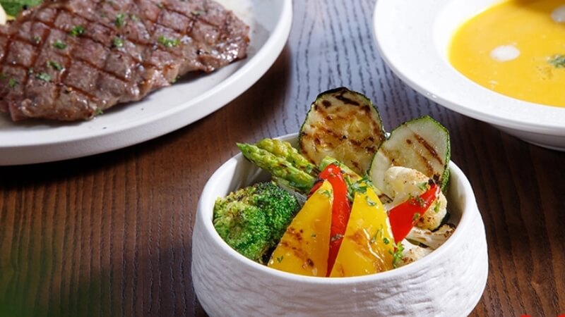Menu: Steak bò Mỹ, bò Úc, Pasta sốt kem, sốt cà chua, Salad rau củ, khoai tây nghiền, Nước ép, soda Ý, rượu vang