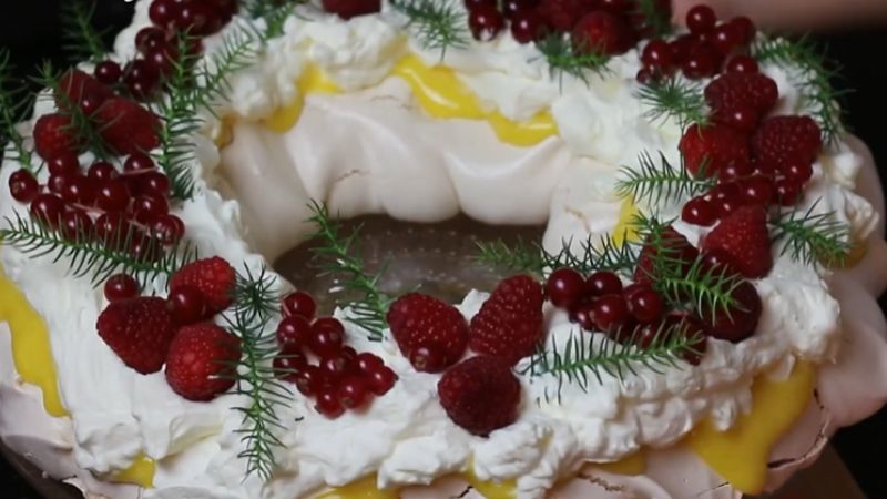 Chiếc bánh pavlova vòng nguyệt quế giòn xốp, chua ngọt từ các loại quả mọng, kem béo ngậy, cực hợp làm món tráng miệng cho tiệc Giáng Sinh ấm áp.