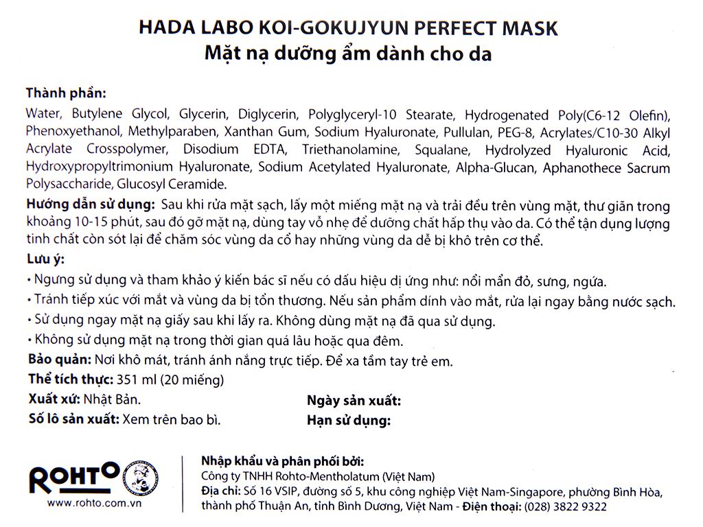 Mặt nạ dưỡng ẩm Hada Labo Koi-Gokujyun Perfect Mask 20 miếng / 351ml