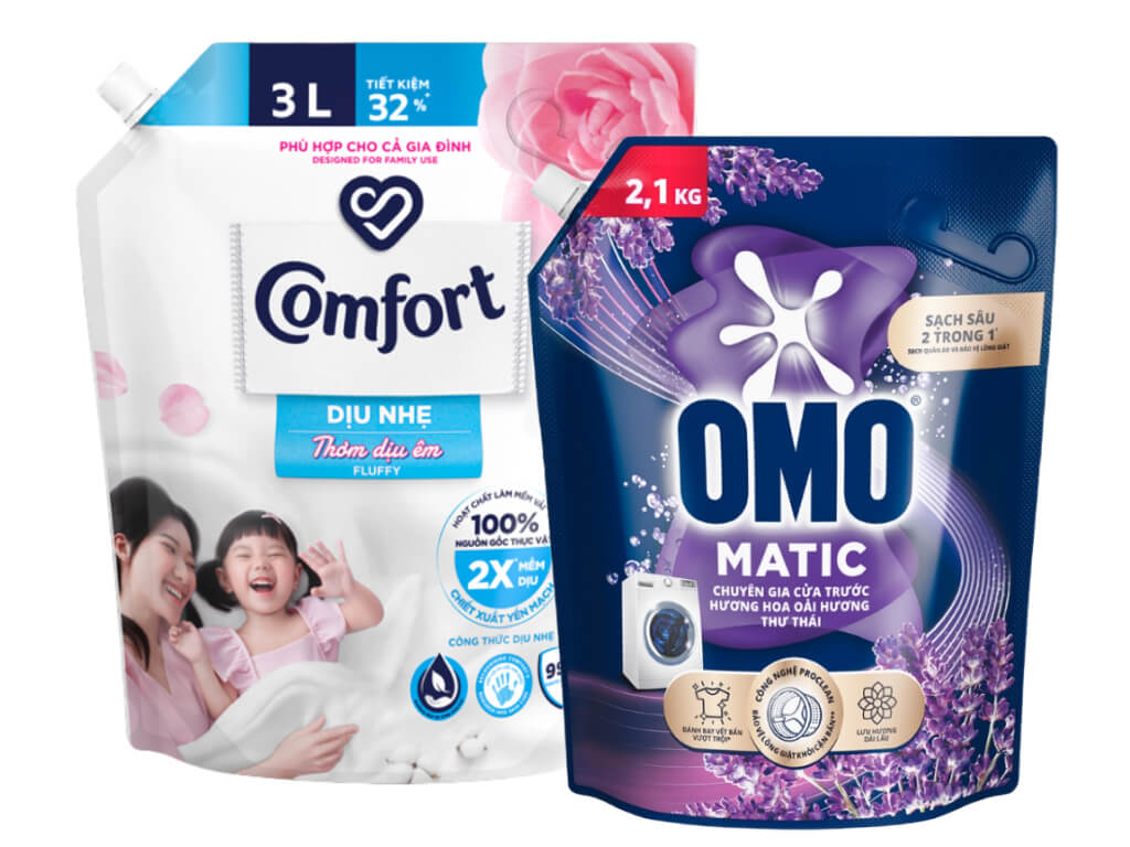 Nước giặt OMO Matic cửa trước hương oải hương 2.1kg và nước xả Comfort dịu nhẹ thơm dịu êm 3 lít