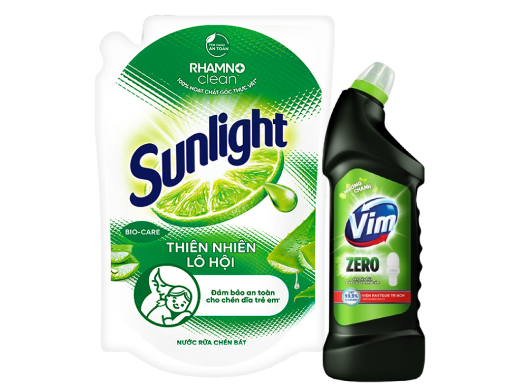 Nước rửa chén Sunlight thiên nhiên lô hội túi 1.9 lít và nước tẩy bồn cầu VIM Zero hương chanh 750ml