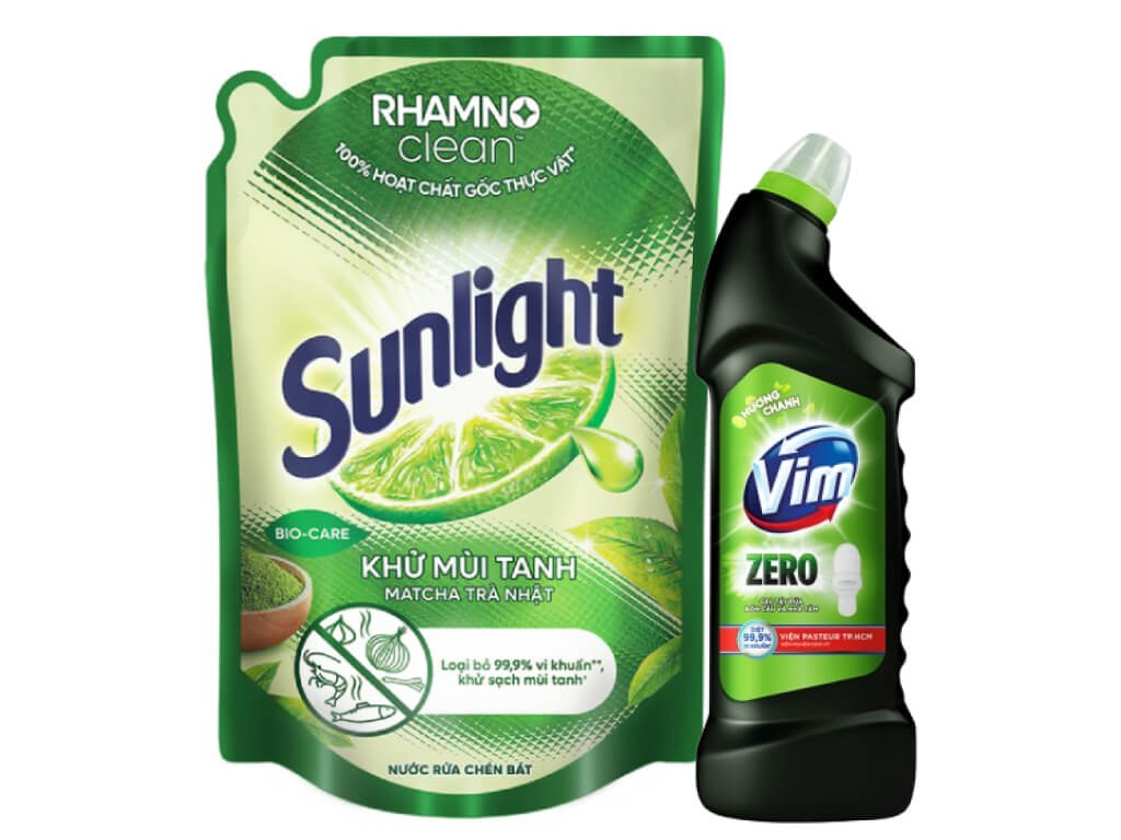 Nước rửa chén Sunlight matcha trà Nhật 1.9l và nước tẩy bồn cầu VIM Zero hương chanh 750ml