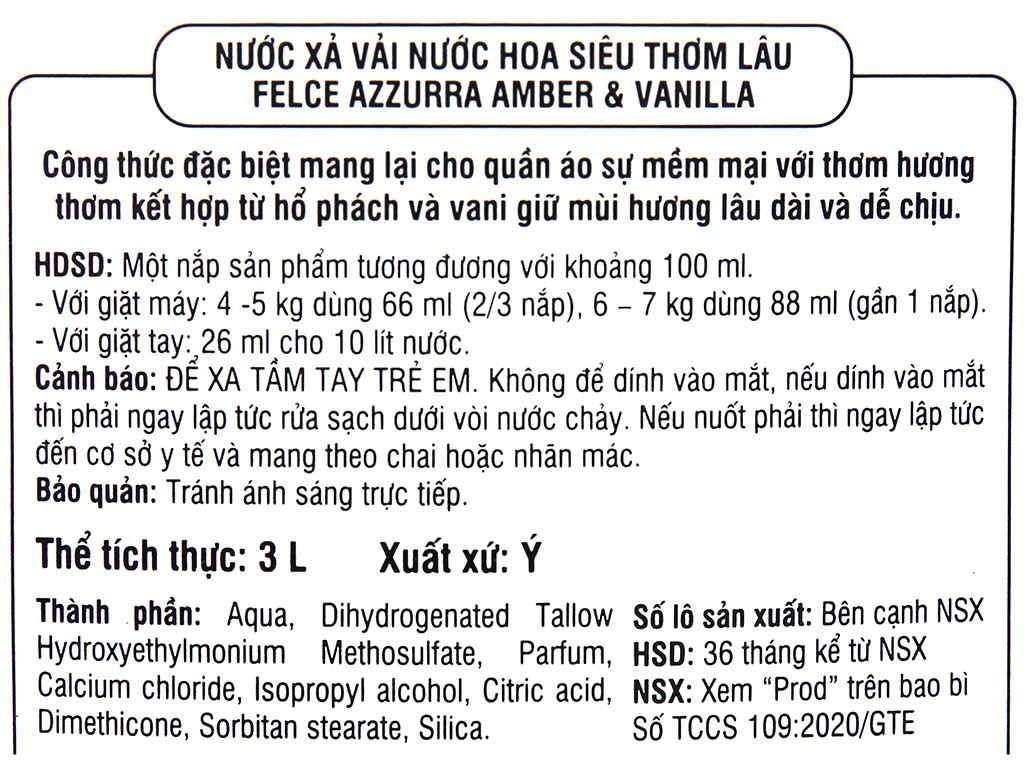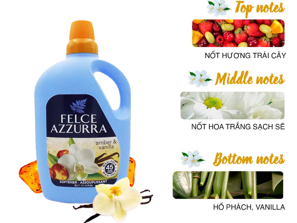 Nước xả vải đậm đặc nước hoa Felce Azzurra hương Amber & Vanilla chai 3 lít