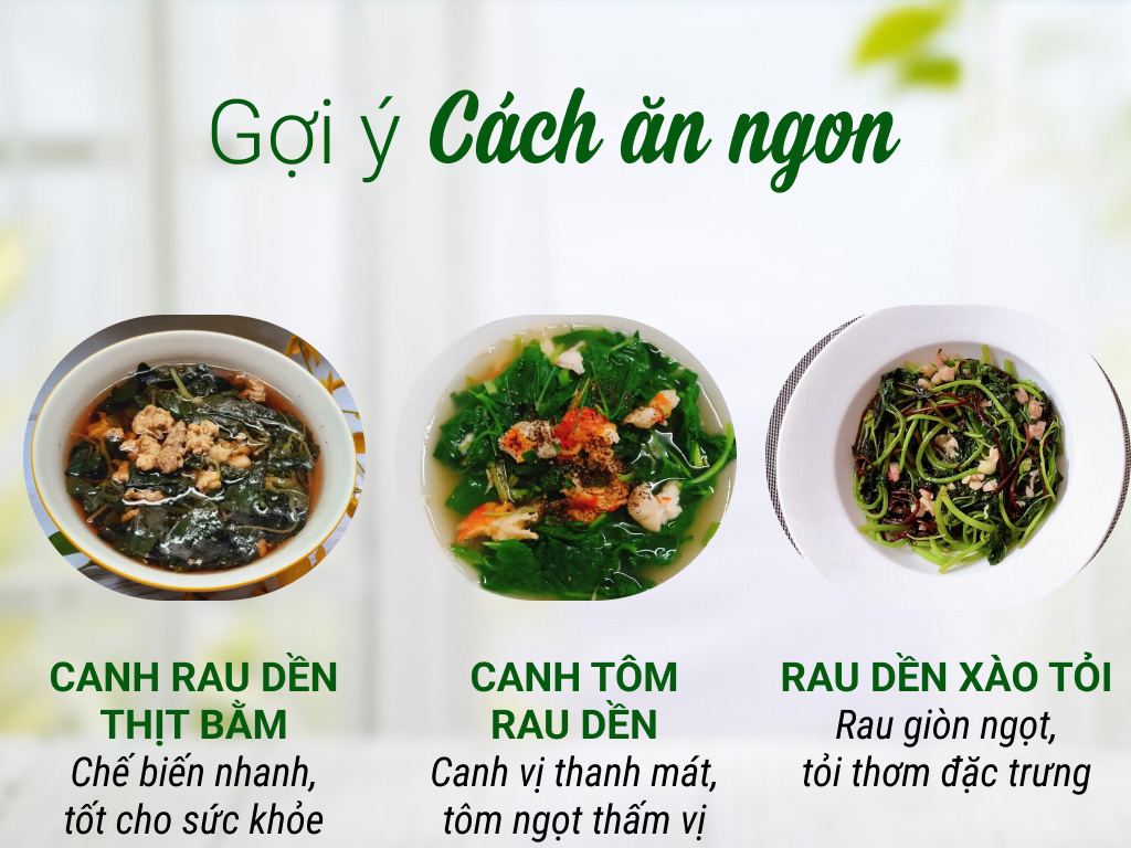 Thông thường, rau dền được kết hợp với thịt băm, tôm khô hoặc tôm tươi,... để cho ra những món canh thơm ngon và bổ dưỡng như canh rau dền thịt băm, canh rau dền tôm khô,...Cách bảo quản rau dền tươi ngon