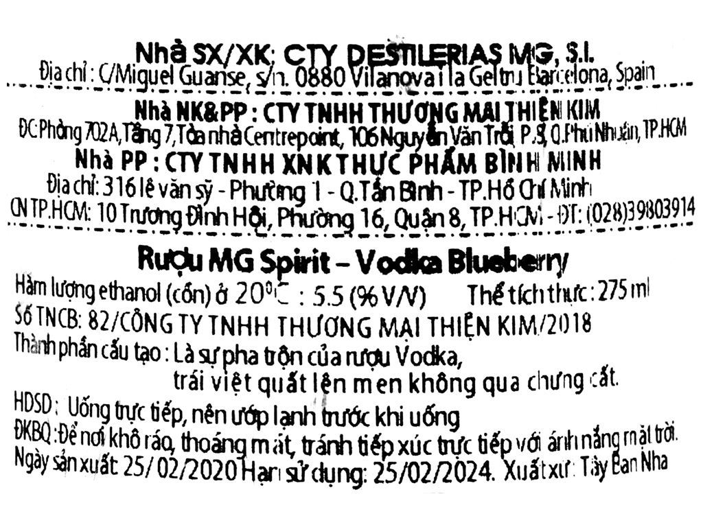 Rượu MG Spirit Vodka Blueberry hương việt quất 5.5% chai 275ml