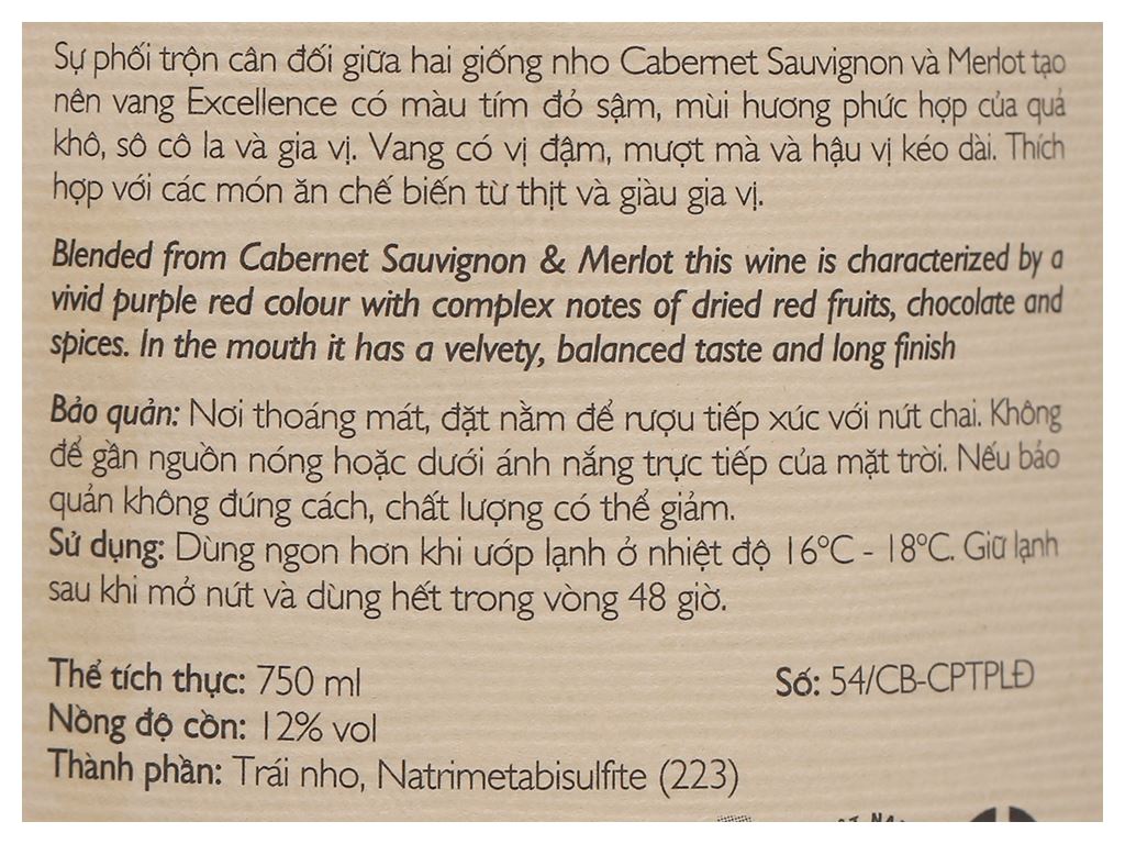Rượu Vang Đà Lạt Excellence đỏ 12% chai 750ml