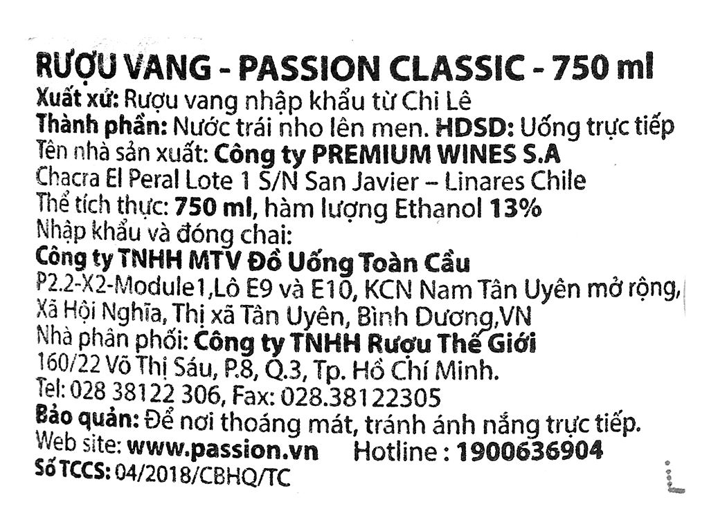 Rượu vang đỏ Passion Classic 13% chai 750ml