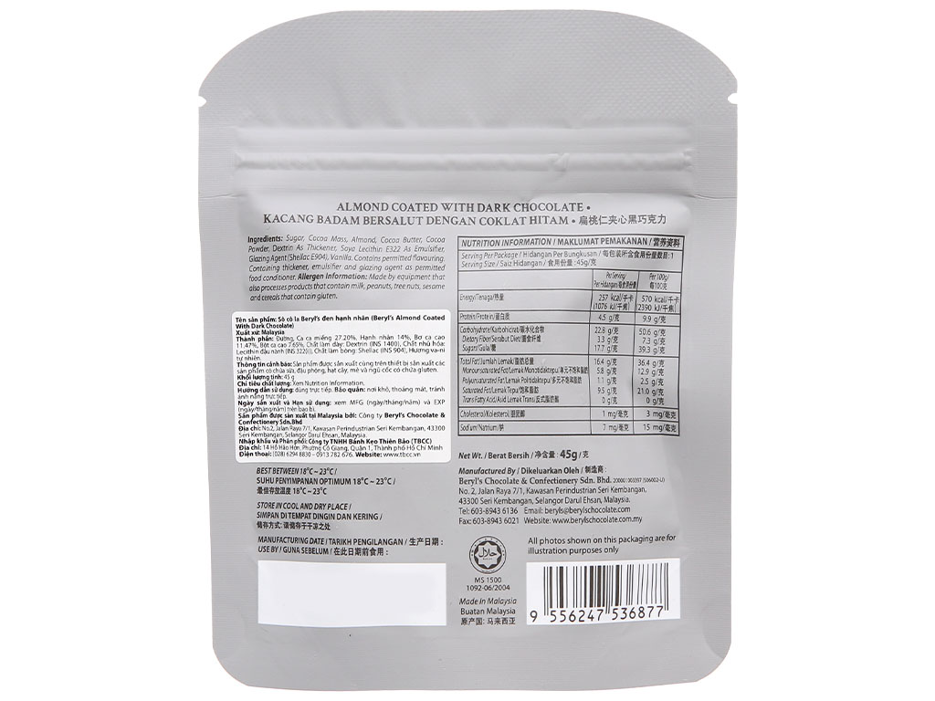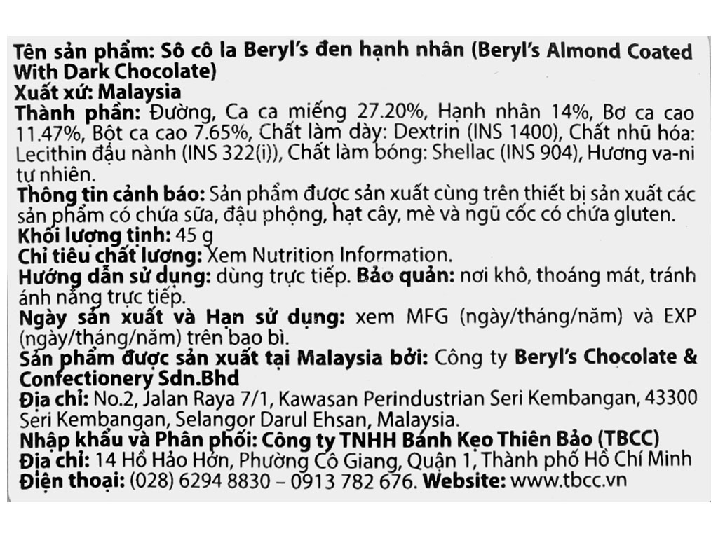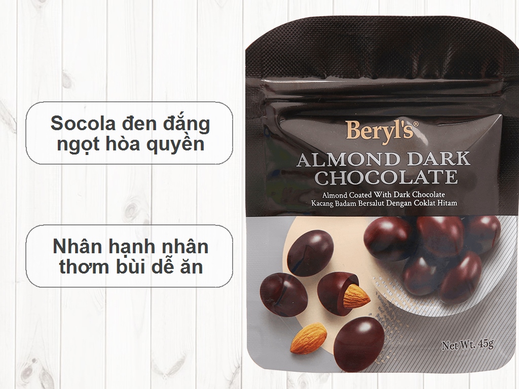 Socola đen hạt hạnh nhân Beryl's gói 45g